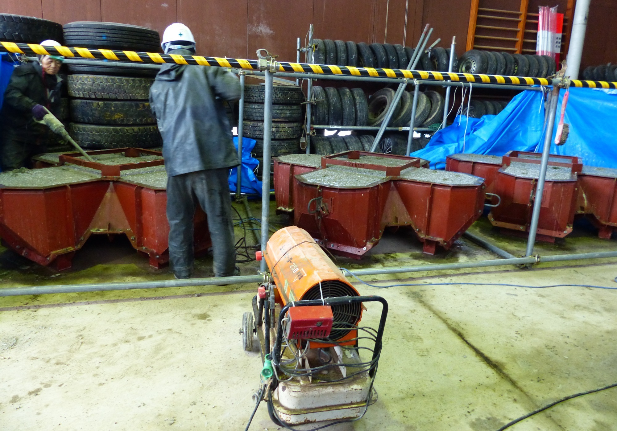 外では雪が降る中、生コン打設し、ブロック作製してます。