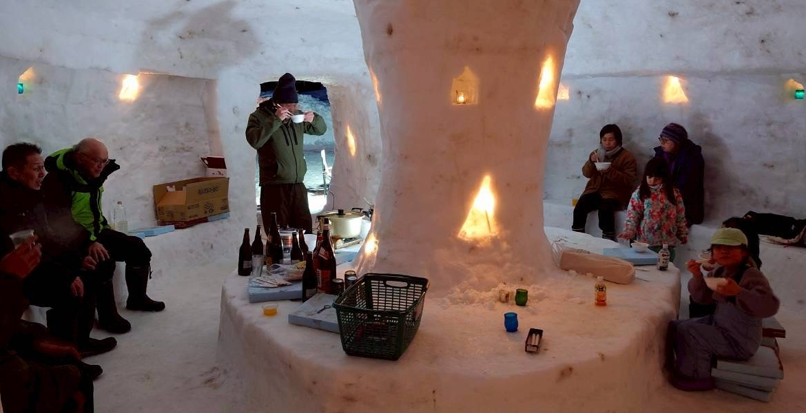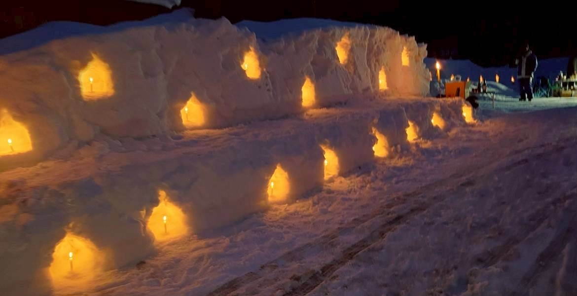 暗くなり始める18時過ぎには、雪の壁やかまくらの中にロウソクでライトアップされており、神秘的な光景でした。