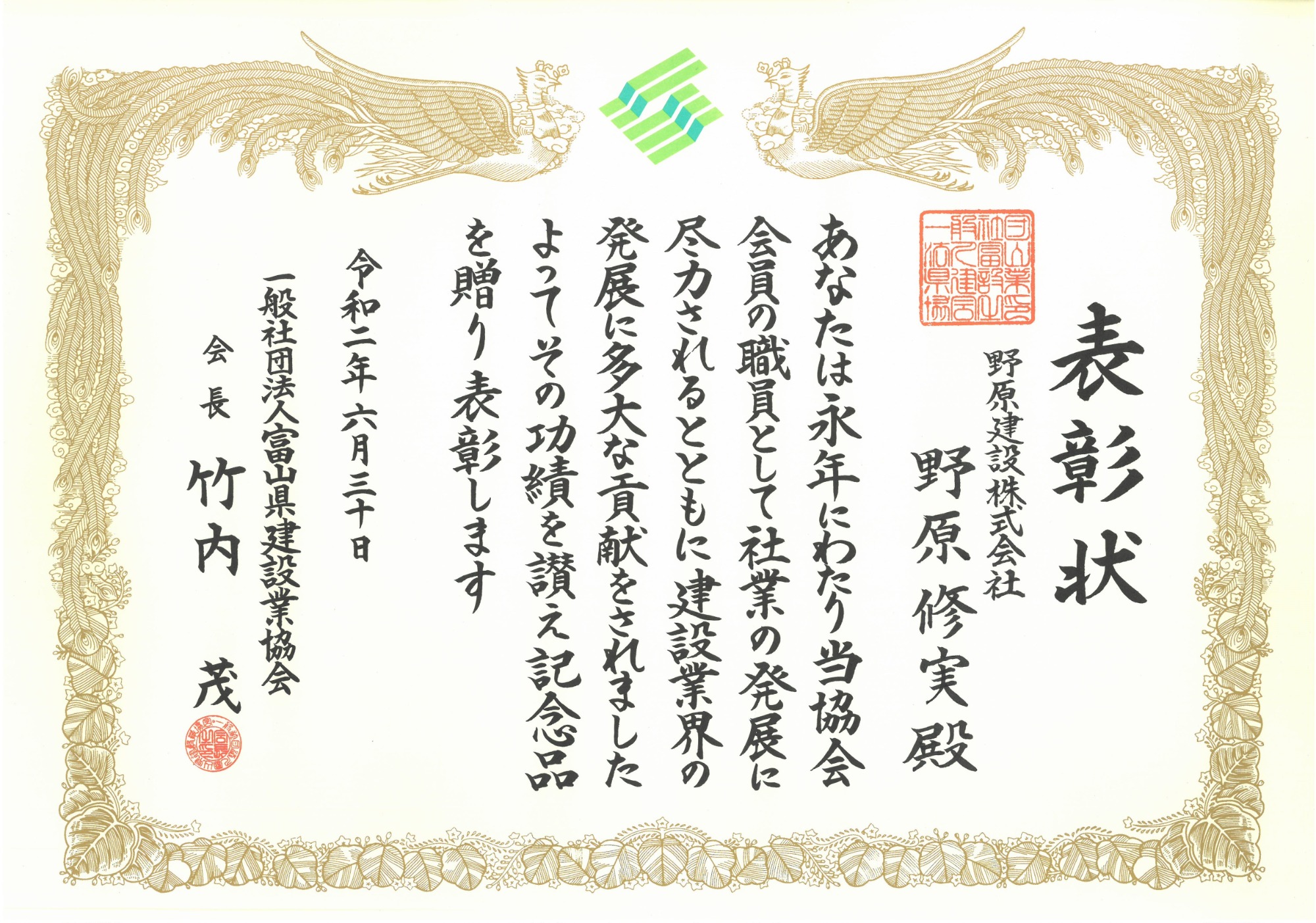 当社従業員の野原氏が、富山県建設業協会より、永年の功績を讃えられ永年勤続者表彰を受けました。これからも、従業員の模範となるご活躍を期待しています。