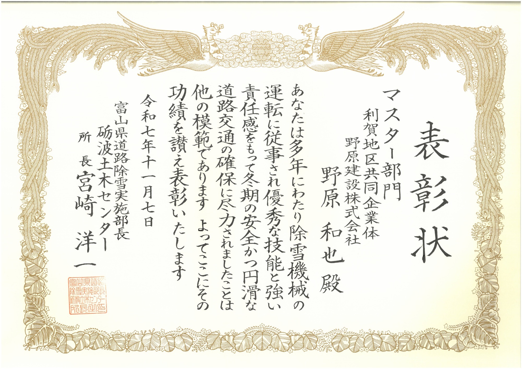 当社従業員の野原和也氏が、富山県砺波土木センターより道路除雪功労者表彰を受けました。